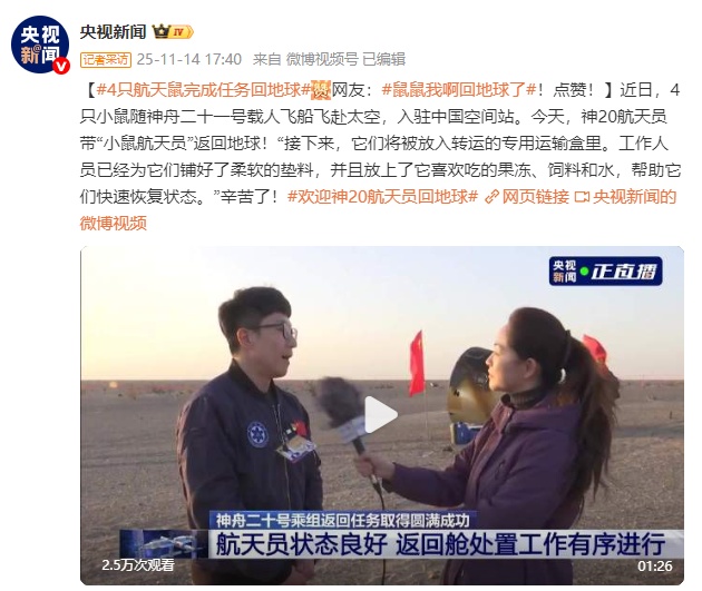 原标题:4只航天鼠完成任务回地球 网友:鼠鼠我啊回地球了!点赞!