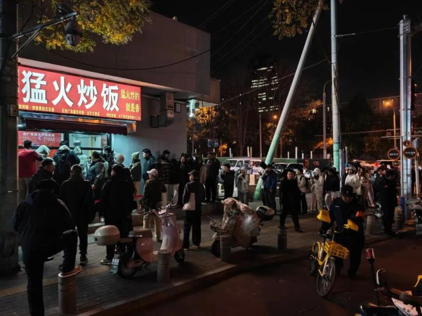 十一月三日傍晚,“猛火炒饭”的灯箱在团结湖畔静静亮起。从下午五点直到凌晨三点,那口熟悉的炒锅不曾停歇,慕名而来的长队,从“流动的风景”变成了“安稳的日常”。