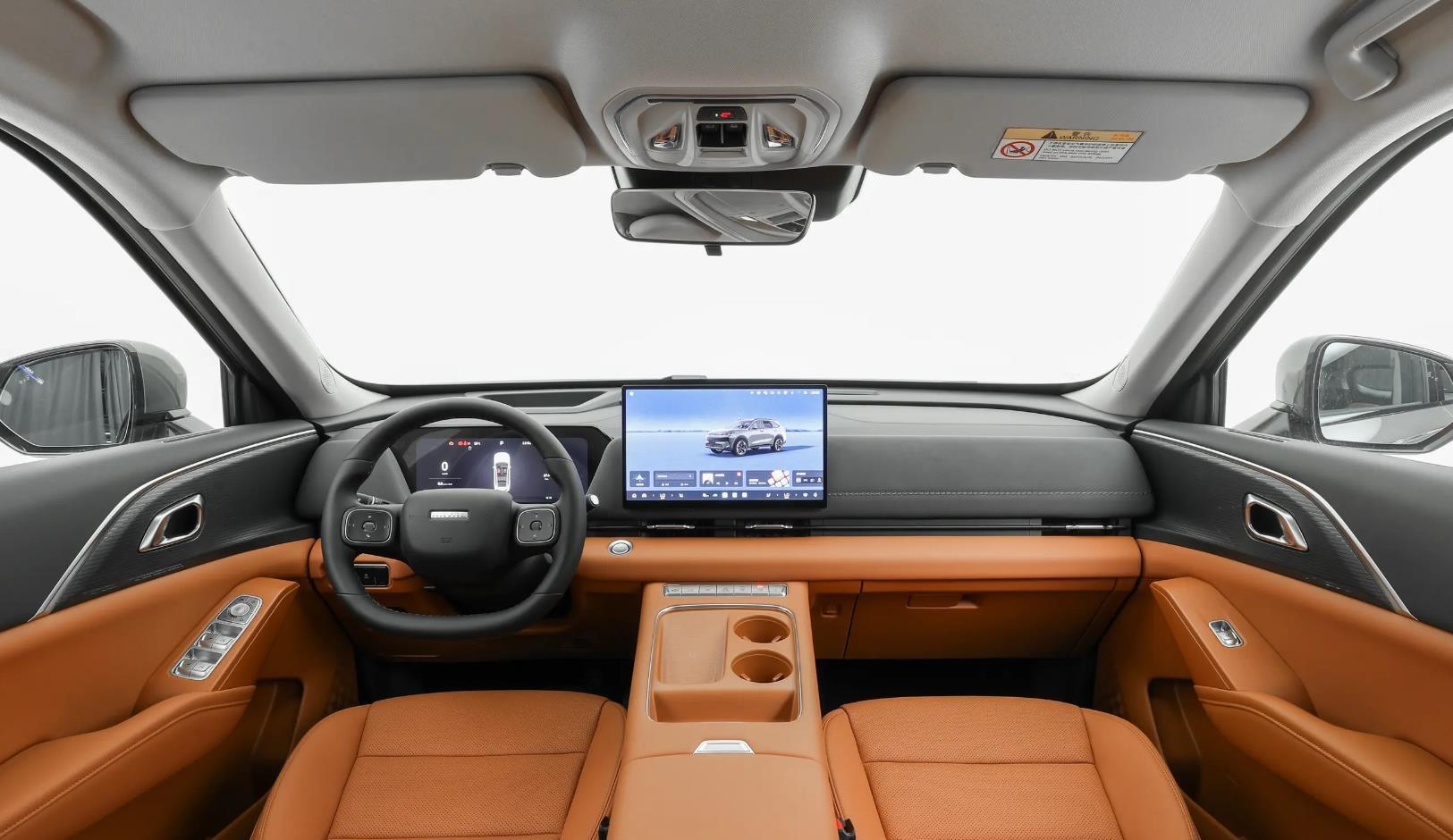 来到内饰,为了满足不同年龄层的需求,同样推出三种不一样颜色的内饰布局,分别为峡谷棕、秋褐米、探秘黑,但我觉得家用选择探秘黑是最好的最实用的。而且峡谷棕给人感觉更豪华一些,秋褐米给人感觉更有质感一些。内饰也是给人焕然一新的感觉,整体布局更加平整简约,更靠近新能源汽车的风格。双色的搭配也带来十足的时尚氛围,而且中控台前排采用绒毛材质包裹,可惜车顶并没有采用绒毛材质。但它皮革覆盖面积比较广,车门、扶手等细节都有软包。液晶仪表的造型也改为倒梯形,并采用12.3英寸的尺寸,而且中控屏是14.6英寸,并配有10英寸的HUD抬头显示。包括可以看见的双水杯架,50瓦的无线充,64色氛围灯、储物格和一键启动等功能。